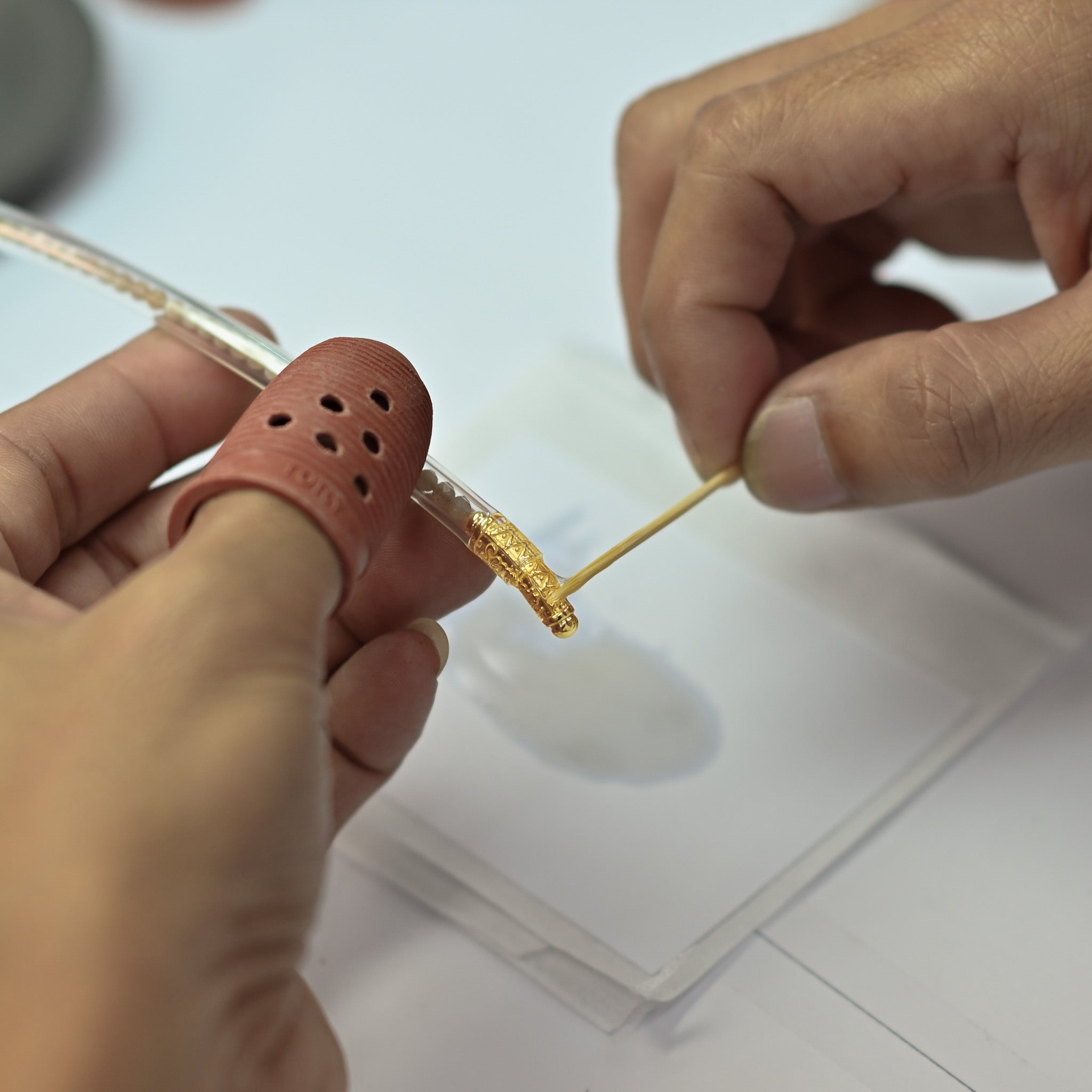 Następny krok jest najdelikatniejszy — umieszczenie Koralika Spokoju — wykonywane jest całkowicie ręcznie. Za pomocą specjalnego kleju i pewnego dotyku rzemieślnik mocno i z szacunkiem przytwierdza koralik do rurki nasączonej złotem. Ta cicha chwila zjednoczenia łączy wszystkie elementy: tajskie rzemiosło, wyrafinowaną biżuterię i rytualny wzór. To miejsce, gdzie forma spotyka się z sensem, a Twój Bransoletka Na Każdą Pogodę® staje się całością — gotową, by nieść Twoje zamiary w świat.