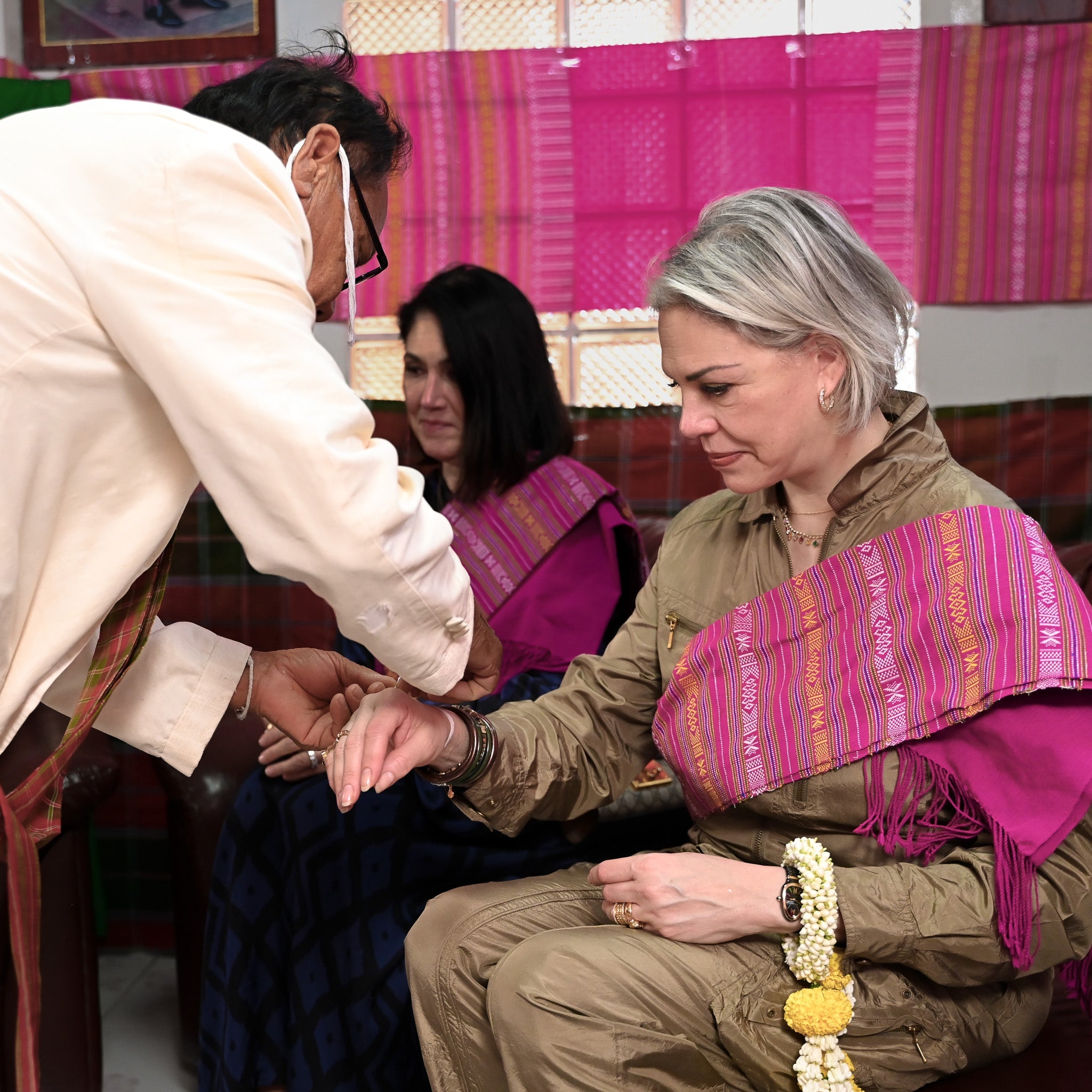 W chwili zarówno osobistej, jak i głębokiej, starszyzna wioski wiąże święty sznurek sai-sin wokół nadgarstka Jessiki Jesse — gest ochrony, jedności i serdecznego błogosławieństwa. Dla Jessiki to coś więcej niż ceremonia. To głębokie uznanie dla rzemieślników, rodzin i tradycji, które tchną życie w każdą bransoletkę BuDhaGirl.